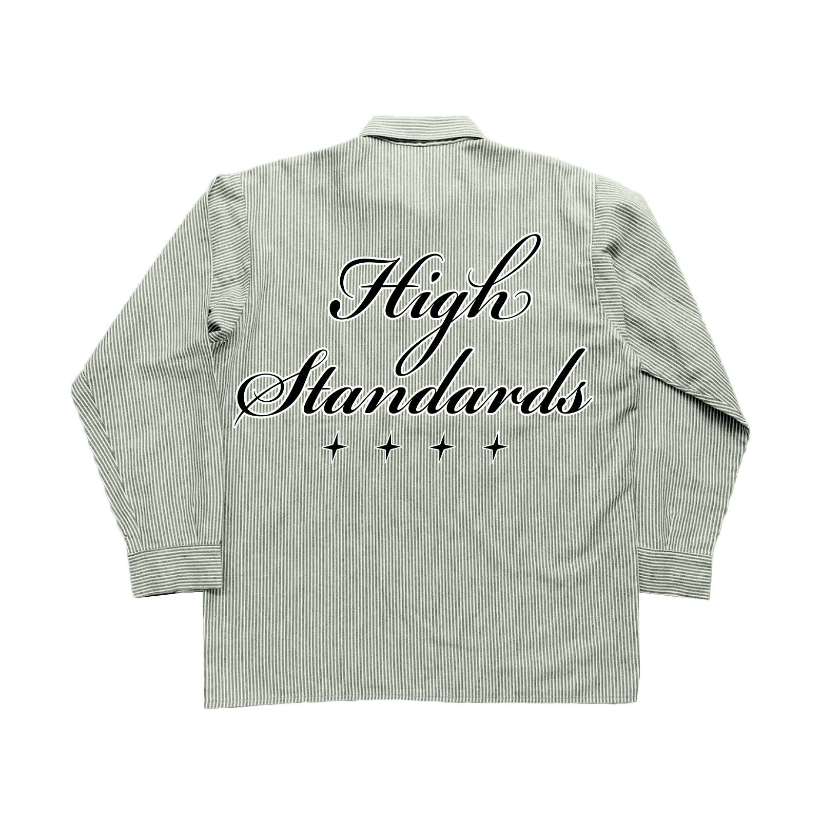 Custom-fit cut and sewn cotton Pin Stripe Zipper Flannel with HS print on the front pocket and High Standards print logo on the back.